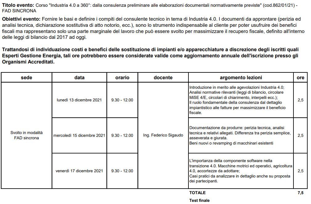 • Corso di approfondimento tecnico in tema di Industria 4.0 tenuto per la Fondazione dell'Ordine degli Ingegneri della Provincia di TorinoFormazione
